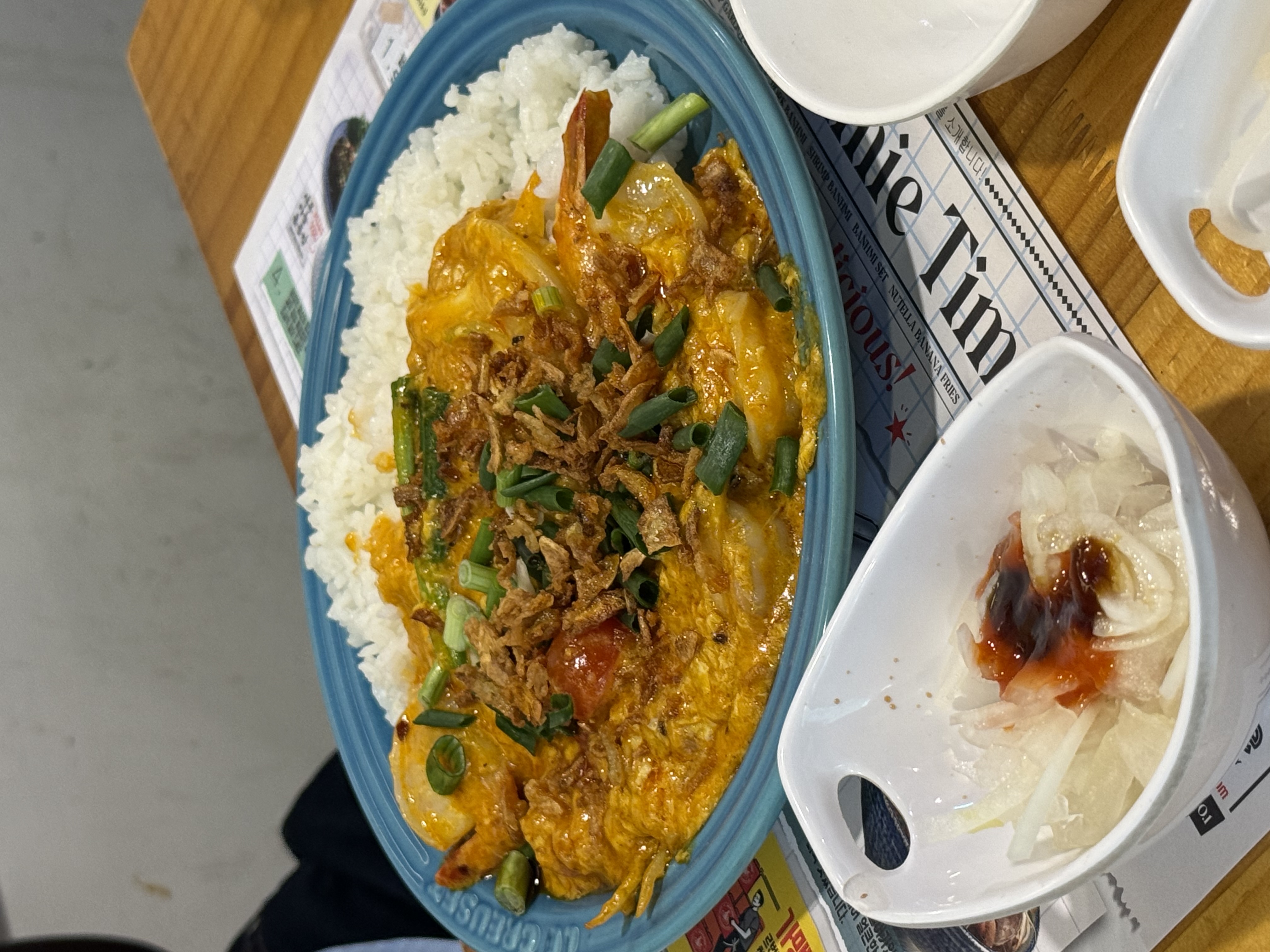 푸팟퐁커리는 게살을 커리 소스에 볶은 태국 요리다. 계란이 부드럽게 풀어진 커리 소스에 새우와 해산물이 듬뿍 들어가 있었다.