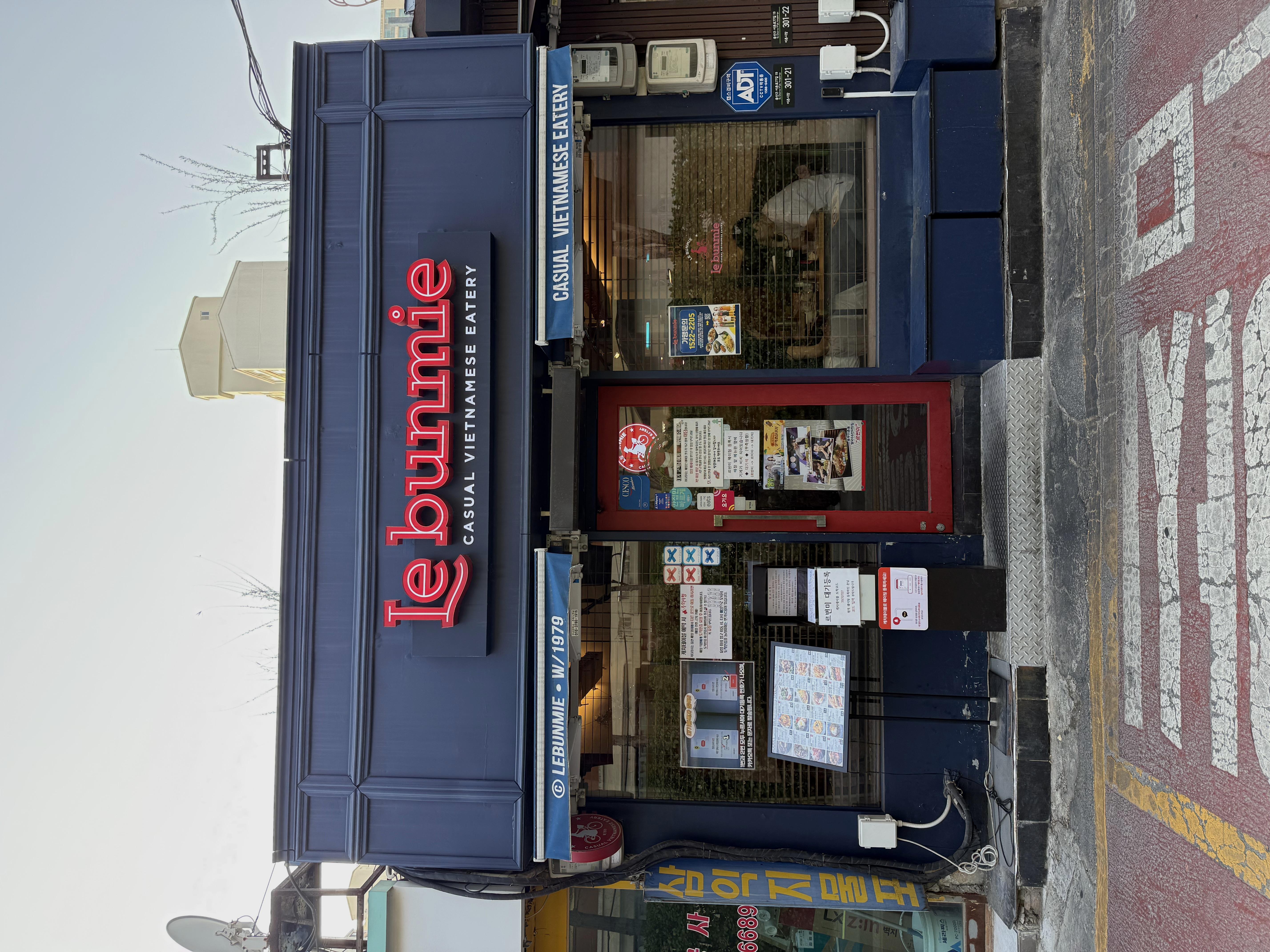 남색 외관에 빨간 네온 간판이 눈에 띈다. "Le bunmie — Casual Vietnamese Eatery"라고 적혀있다.
