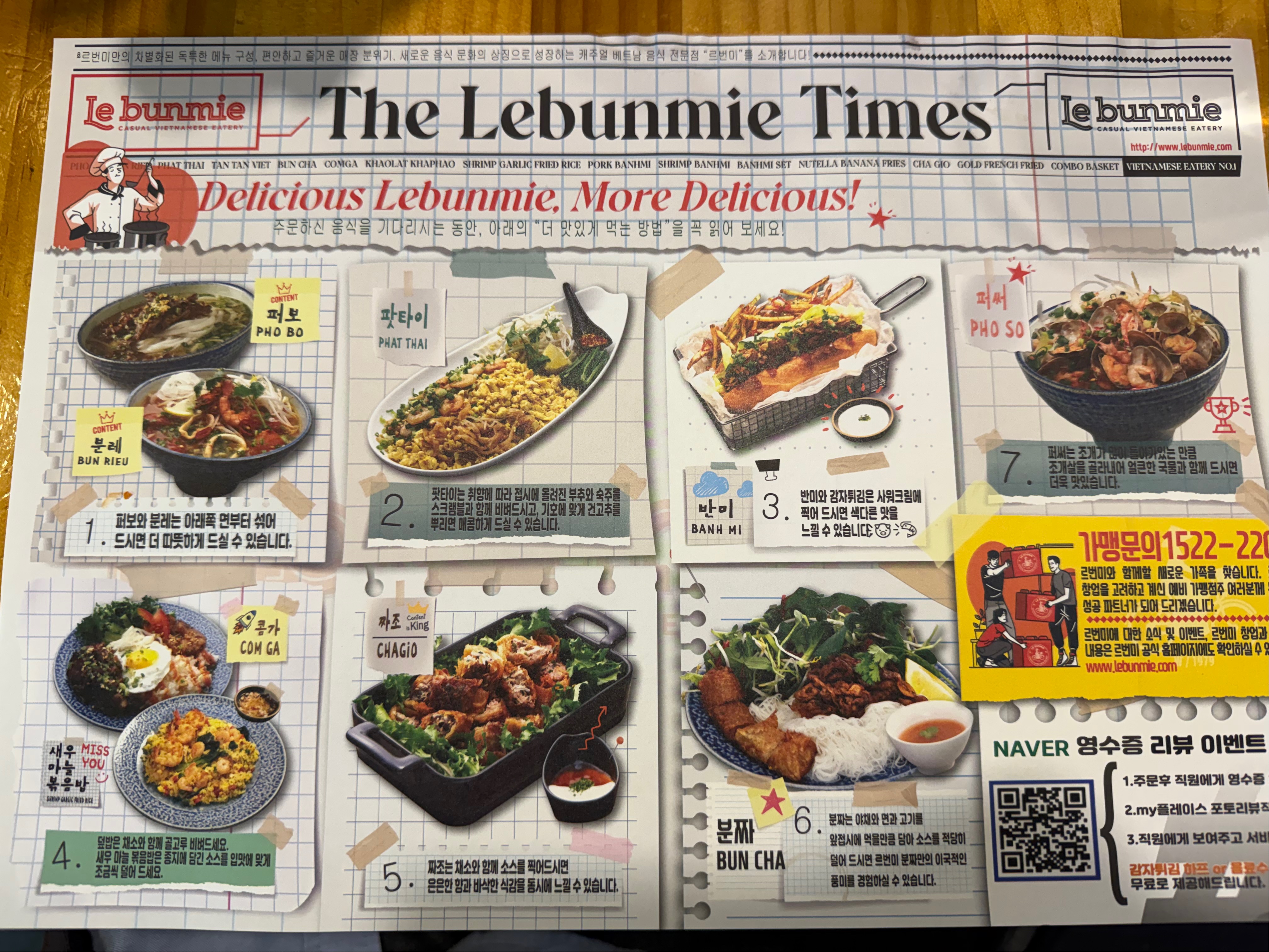 테이블에 깔려있는 "The Lebunmie Times" 신문지 스타일 매트가 재밌다. 메뉴 추천과 먹는 법이 적혀있다.