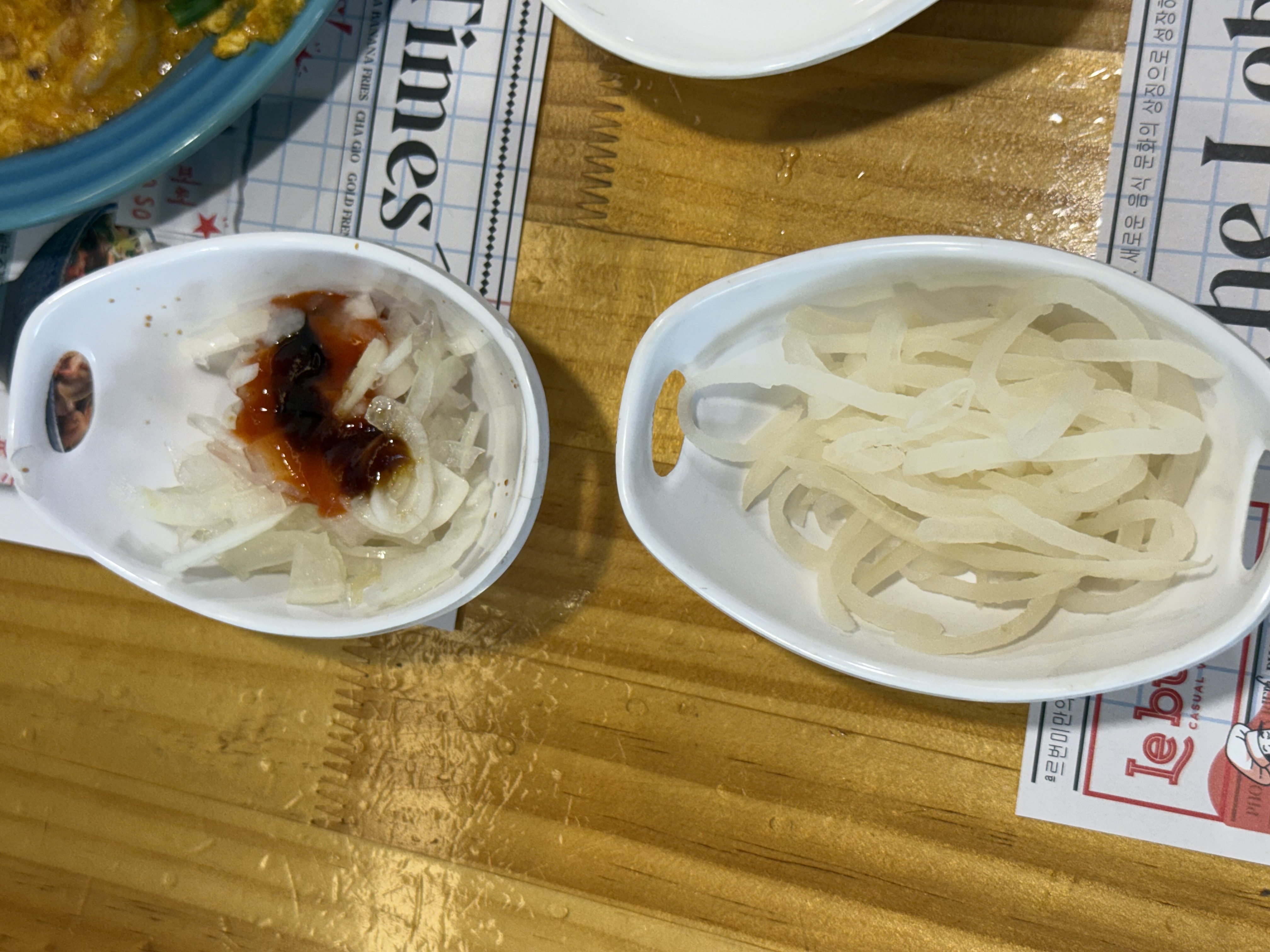 반찬으로 양파절임과 소스가 나온다. 느끼한 맛을 잡아주는 역할을 한다.