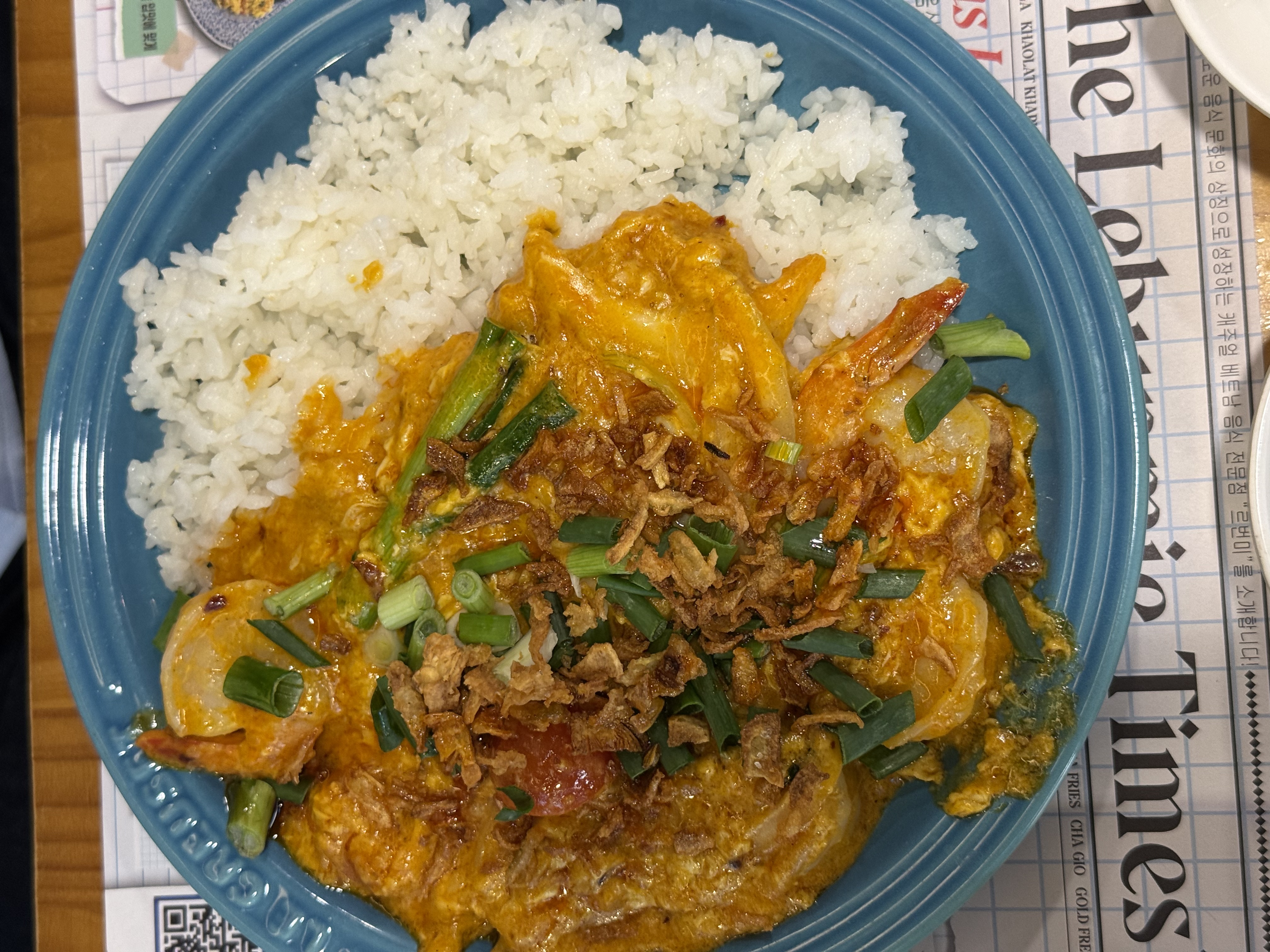 푸팟퐁커리는 게살을 커리 소스에 볶은 태국 요리다. 계란이 부드럽게 풀어진 커리 소스에 새우와 해산물이 듬뿍 들어가 있었다.