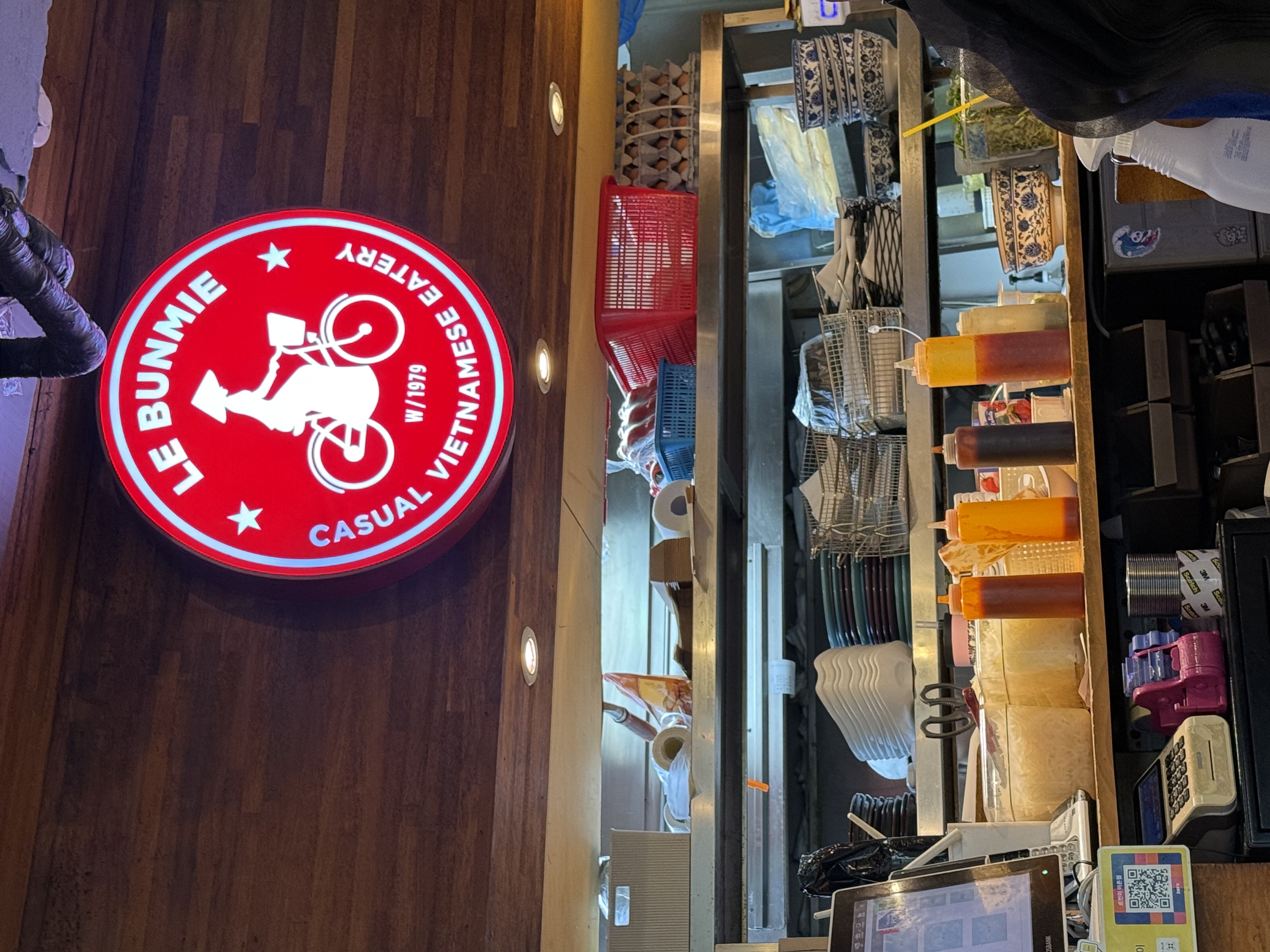 남색 외관에 빨간 네온 간판이 눈에 띈다. "Le bunmie — Casual Vietnamese Eatery"라고 적혀있다.