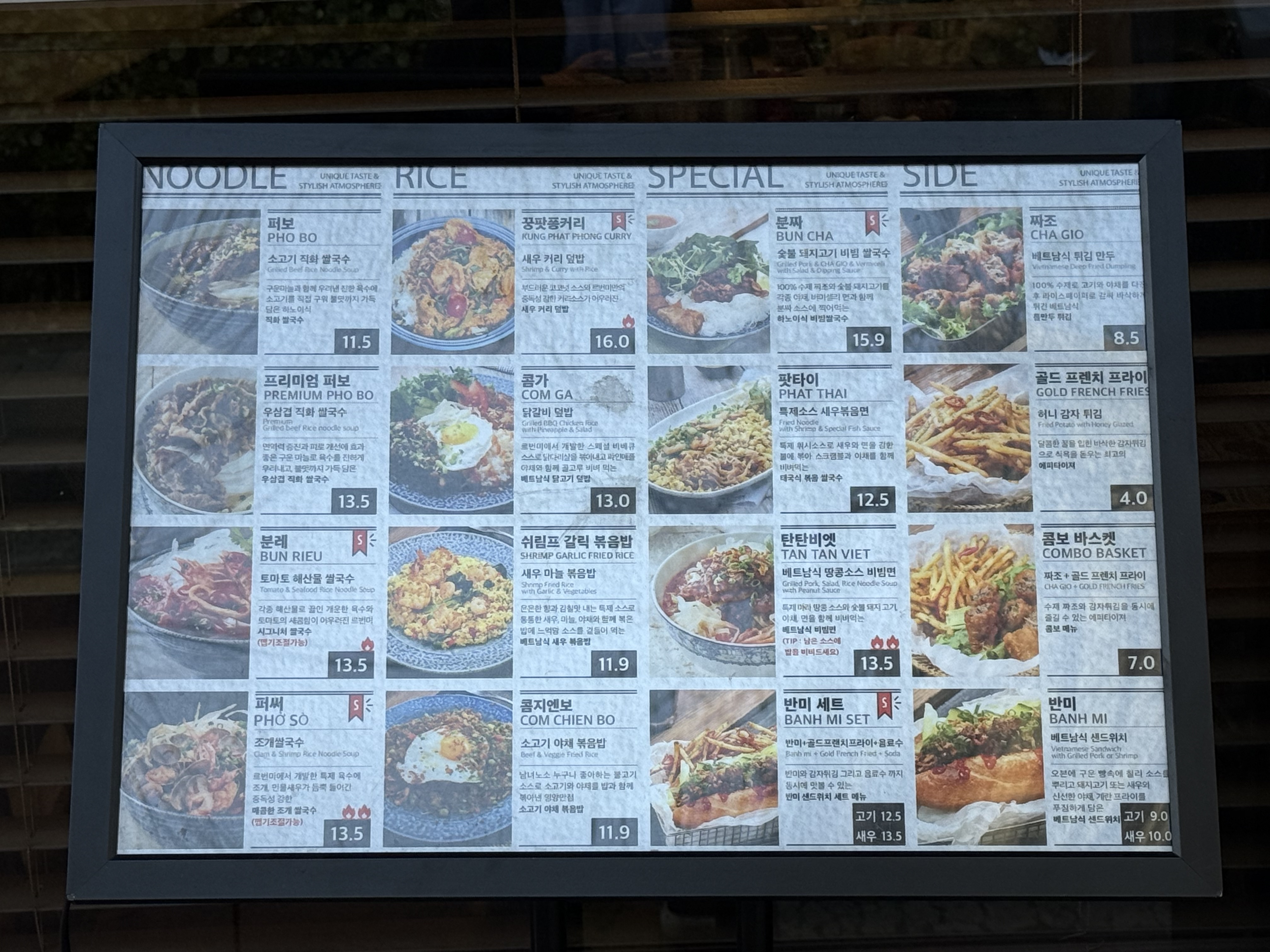 메뉴는 크게 NOODLE, RICE, SPECIAL, SIDE로 나뉜다. 쌀국수(퍼보, 분레), 덮밥류(콤가, 꼼찌엔보), 팟타이, 푸팟퐁커리, 반미까지 다양하다. 가격대는 11,000원~16,000원 정도.